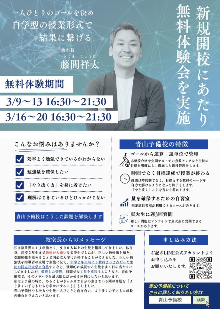 今年から始まる青山予備校でも、むやみに厳しい管理はしません。大切なのは、生徒本人が「今日はこれをやり抜こう」と納得して机に向かうこと。 私たちは、その意欲を削がないよう、しかし甘えで見失わないよう、絶妙な距離感で支え続けます。「自分の力で最後までやり切った」という誇らしい経験は、受験だけでなく、これからの長い人生でも必ず役に立つ。そう確信しています。 一緒に、やり抜ける自分を育てていきましょう。